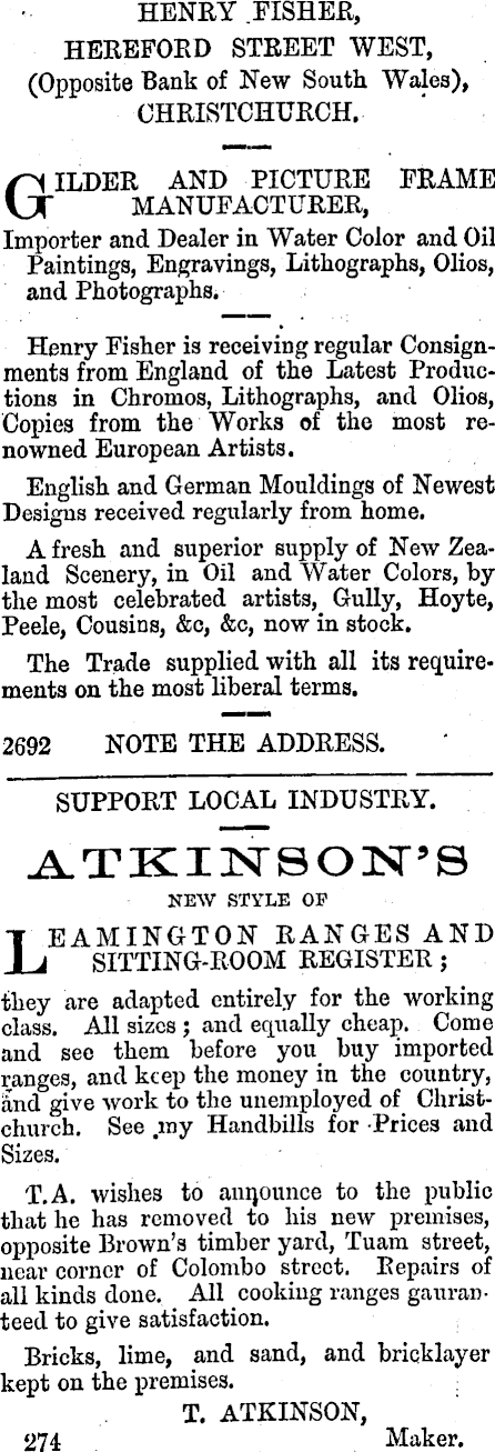 HENRY FISHER, HEREFORD STREET WEST, (Opposite Bank of New South Wales), CHRISTCHURCH. Gilder and picture frame MANUFACTURER, Importer and Dealer in Water Color and Oil Paintings, Engravings, Lithographs, Olios, and Photographs. Henry Fisher is receiving regular Consignments from England of the Latest Productions in Chromos, Lithographs, and Olios, Copies from the Works of the most renowned European Artists. English and German Mouldings of Newest Designs received regularly from home. A fresh and superior supply of New Zealand Scenery, in Oil and Water Colors, by the most celebrated artists, Gully, Hoyte, Peele, Cousins, &c, &c, now in stock. The Trade supplied with all its requirements on the most liberal terms. 2692 NOTE THE ADDRESS. SUPPORT LOCAL INDUSTRY. A. T KINS ON’S NEW STYLE OF LEAMINGTON RANGES AND SITTING-ROOM REGISTERj they are adapted entirely for the working class. All sizes ; and equally cheap. Come and see them before you buy imported ranges, and keep the money in the country, and give work to the unemployed of Christchurch. See .my Handbills for Prices and Sizes, T.A, wishes to announce to the public that he has removed to his new premises, opposite Brown’s timber yard, Tuam street, near corner of Colombo street. Repairs of all kinds done. All cooking ranges gauranteed to give satisfaction. Bricks, lime, and sand, and bricklayer kept on the premises. T. ATKINSON, 274 Maker.
