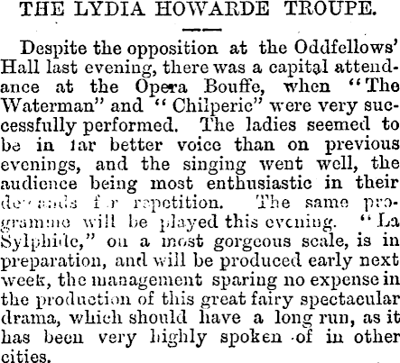 THE LYDIA HOWARDS TROUPE. Despite the opposition at the Oddfellows’ Hall last evening, there was a capital attendance at the Opera Bouffe, when “The Waterman” and “ Chilperic” were very successfully performed. The ladies seemed to be in lar better voice than on previous evenings, and the singing went well, the audience being most enthusiastic in their dc- rods f r repetition. The same programme will be played this evening. “La Sylphidc,” on a most gorgeous scale, is in preparation, and will be produced early next week, the management sparing no expense in the production of this great fairy spectacular drama, which should have a long run, as it has been very highly spoken of in other cities.