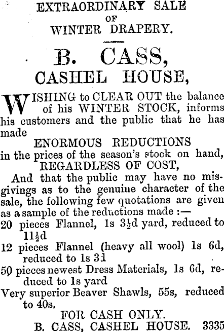 EXTRAORDINARY SALE OF WINTER DRAPERY. • B. CASS, CASHEL, HOUSE, WISHING- to CLEAR OUT tlxe balance of his WINTER, STOCK, informs his customers and the public that he has made ENORMOUS REDUCTIONS in the prices of the season’s stock on hand, REGARDLESS OF COST, And that the public may have no misgivings as to the genuine character of the sale, the following few quotations are given as a sample of the reductions made ; 20 pieces Flannel, Is yard, reduced to ll£d 12 pieces Flannel (heavy all wool) Is 6d, reduced to Is 31 50 pieces newest Dress Materials, Is Gd, reduced to Is yard Very superior Beaver Shawls, 555, reduced to 40s, FOR CASH ONLY. B. CASS, CASHEL HOUSE. 3335