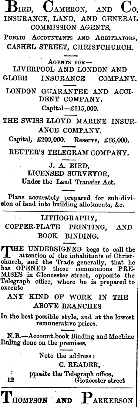 Bird, Cameron, and Co, INSURANCE, LAND, AND GENERAL COMMISSION AGENTS, Public Accountants and Arbitrators, CASHEL STREET, CHRISTCHURCH. A PAp - LIVERPOOL AND LONDON AND GLOBE INSURANCE COMPANY. LONDON GUARANTEE AND ACCIDENT COMPANY. Capital—£lls,ooo. THE SWISS LLOYD MARINE INSURANCE COMPANY. Capital, £200,000. Reserve, £66,000. REUTER’S TELEGRAM COMPANY. J. A. BIRD, LICENSED SURVEYOR, Under the Land Transfer Act. # Plans accurately prepared for sub-divi-sion of laud into building allotments, &c. LITHOGRAPHY, COPPER-PLATE PRINTING, AND BOOK BINDING. THE UNDERSIGNED begs to call the attention of the inhabitants of Christchurch, and the Trade generally, that he has OPENED those commonious PREMISES in Gloucester street, opposite the Telegraph office, where he is prepared to execute ANY KIND OF WORK IN THE ABOVE BRANCHES In the best possible style, and at the lowest remunerative prices. N.B.—Account-book Binding and Machine Ruling done on the premises. Note the address: C. READER, pposite the Telegraph office, 12 Gloucester street Thompson and Parkerson
