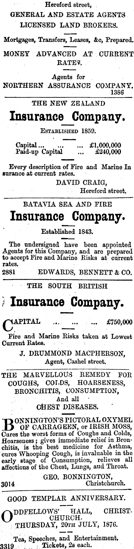 Hereford street, GENERAL AND ESTATE AGENTS LICENSED LAND BROKERS. Mortgages, Transfers, Leases, &c, Prepared. MONEY ADVANCED AT CURRENT RATE?. Agents for NORTHERN ASSURANCE COMPANY. 1386 THE NEW ZEALAND Insurance_Company. Established 1859. Capital £1,000,000 Paid-up Capital ... £240,000 Every description of Fire and Marine In snrance at current rates. DAVID CRAIG, Hereford street. BATAVIA SEA AND FIRE Insurance Company. Established 1843. The undersigned have been appointed Agents for this Company, and are prepared to accept Fire and Marine Risks at current rates. 2881 EDWARDS, BENNETT & CO. THE SOUTH BRITISH ; Insurance Company. QAPITAL £750,000 Fire and Marine Risks taken at Lowest Current Rates. J. DRUMMOND MACPHERSON, Agent, Cashel street. THE MARVELLOUS REMEDY FOR COUGHS, COI.DS, HOARSENESS, BRONCHITIS, CONSUMPTION, And all CHEST DISEASES. BONNINGTON’S PIOTORAL OXYMEL OF CARRAGEEN, or IRISH MOSS, Cares the worst forms of Coughs and Colds, Hoarseness; gives immediate relief in Bronchitis, is the best medicine for Asthma, cures Whooping Cough, is invaluable in the early stage of Consumption, relieves all affections of the Chest, Lungs, aud Throat. GEO. BONNINGTON, 3014 Christchurch, GOOD TEMPLAR ANNIVERSARY, Oddfellows’ hall, Christchurch. THURSDAY, 20th JULY, 1876. Tea, Speeches, and Entertainment. 3319 Tickets, 2s each.