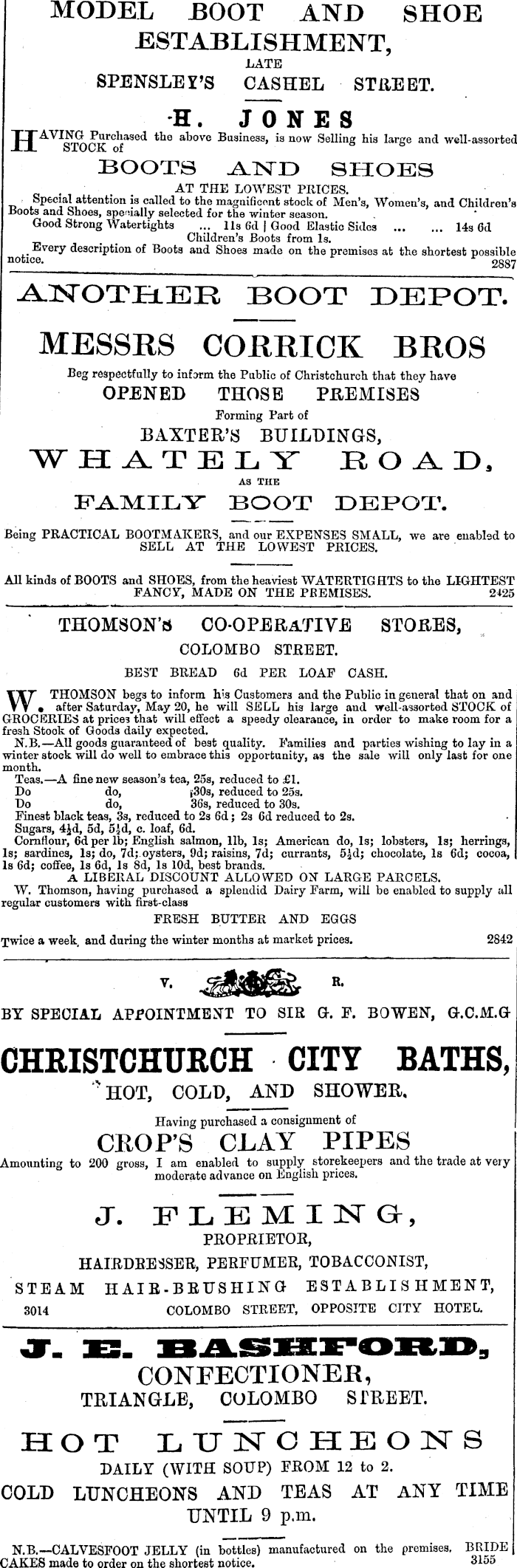 MODEL BOOT AND SHOE ESTABLISHMENT, LATE SPENSLEY’S CASHEL STREET. H. JONES JPureliased. the above Business, is now Selling his large and well-assorted STOCK of BOOTS TV IST D SHOES . . AT THE LOWEST PRICES. Special attention is called to the magnificent stock of Men’s, Women’s, and Children’s Boots and Shoes, specially selected for the winter season. Good Strong Watertights ... lls6d | Good Elastic Sides 14s fld # # Children’s Boots from Is. _ Every description of Boots and Shoes made on the premises at the shortest possible notice. r 0007 ANOTHER BOOT DEPOT. MESSRS CORRICK BROS Beg respectfully to inform the Public of Christchurch that they have OPENED THOSE PREMISES Forming Part of BAXTER’S BUILDINGS, whtatedy boa. d, AS THE FAMILY BOOT DEPOT. Being PRACTICAL BOOTMAKERS, and our EXPENSES SMALL, we are enabled to SELL AT THE LOWEST PRICES. All kinds of BOOTS and SHOES, from the heaviest WATERTIGHTS to the LIGHTEST FANCY, MADE ON THE PREMISES. 2425 THOMSONS CO-OPERATIVE STORES, COLOMBO STREET. BEST BREAD 6d PER LOAF CASH. W THOMSON begs to inform his Customers and the Public in general that on and • after Saturday, May 20, he will SELL his large and well-assorted STOCK of GROCERIES at prices that will effect a speedy clearance, in order to make room for a fresh Stock of Goods daily expected. N.B.—All goods guaranteed of best quality. Families and parties wishing to lay in a winter stock will do well to embrace this opportunity, as the sale will only last for one month. Teas.—A fine new season’s tea, 255, reduced to £l. Do do, f3os, reduced to 255. Do do, 365, reduced to 30s. Finest black teas, 3s, reduced to 2s 6d; 2s 6d reduced to 2s. Sugars, 4£d, sd, s£d, c. loaf, 6d. Cornflour, 6d per lb; English salmon, lib, Is; American do, Is; lobsters, Is; herrings, Is; sardines, Is; do, 7d; oysters, 9d; raisins, 7d; currants, s£d; chocolate, Is 6d; cocoa, Is 6d; coffee, Is 6d, Is Bd, Is lOd, best brands. A LIBERAL DISCOUNT ALLOWED ON LARGE PARCELS. W. Thomson, having purchased a splendid Dairy Farm, will be enabled to supply all regular customers with first-class FRESH BUTTER AND EGGS Twice a week and during the winter months at market prices. 2842 V. R. BY SPECIAL APPOINTMENT TO SIR GK F. BOWEN, GKC.M.G CHRISTCHURCH CITY BATHS, ' HOT, COLD, AND SHOWER, Having purchased a consignment of CROP’S CLAY PIPES Amounting to 200 gross, I am enabled to supply storekeepers and the trade at very moderate advance on English prices. J. FLEMING, PROPRIETOR, HAIRDRESSER, PERFUMER, TOBACCONIST, STEAM H AIE-BRUSHINO ESTABLISHMENT, 3014 COLOMBO STREET, OPPOSITE CITY HOTEL, J. E. BASHFORD, CONFECTIONER, TRIANGLE, COLOMBO STREET. HOT L TJ~N r C HE ON S DAILY (WITH SOUP) THOM 12 to 2. COLD LUNCHEONS AND TEAS AT ANY TIME UNTIL 9 p.m. N.B.—CALVESFOOT JELLY (in bottles) manufactured on the premises. BRIDE CAKES made to order on the shortest notice. 3155