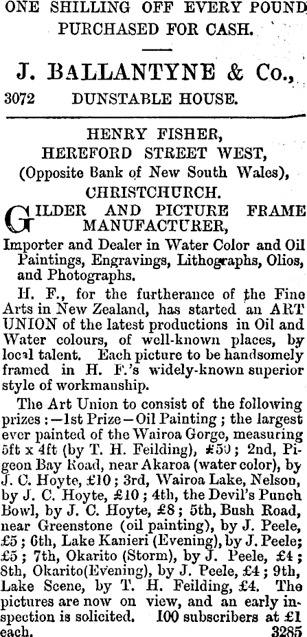 ONE SHILLING OFF EVERY POUND PURCHASED FOR CASH. J. BALLANTYNE & Co., 3072 DUNSTABLE HOUSE. HENRY FISHER, HEREFORD STREET WEST, (Opposite Bank of New South Wales), CHRISTCHURCH. Gilder and picture frame MANUFACTURER, Importer and Dealer in Water Color and Oil Paintings, Engravings, Lithographs, Olios, and Photographs. H. F., for the furtherance of the Fine Arts in New Zealand, has started an ART UNION of the latest productions in Oil and Water colours, of well-known places, by 100 l talent. Each picture to be handsomely framed in H. F.’s widely-known superior style of workmanship. The Art Union to consist of the following prizes Ist Prize Oil Painting ; the largest ever painted of the Wairoa Gorge, measuring sft x 4ft (by T. H. Feilding), £5'J; 2nd, Pigeon Bay Koad, near Akaroa (water color), by J. C. Hoyte, £10; 3rd, Wairoa Lake, Nelson, by J. C. Hoyte, £lO ; 4th, the Devil’s Punch Bowl, by J. C. Hoyte, £8 ; sth, Bush Road, near Greenstone (oil painting), by J. Peele, £5 ; Gth, Lake Kanieri (Evening), by J. Peele; £5 ; 7th, Okarito (Storm), by J. Peele, £4 ; Bth, Okarito(Eveniug), by J. Peele, £4 ; 9th, Lake Scene, by T. H. Feilding, £4. The pictures are now on view, and an early inspection is solicited. 100 subscribers at £1 each. 3285