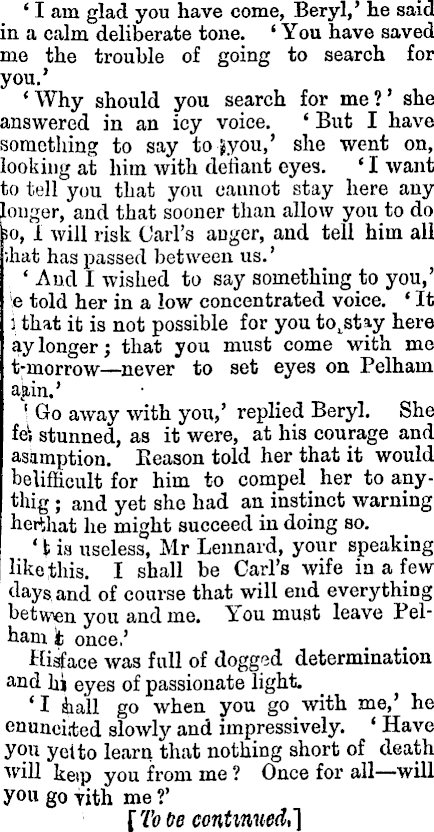 ‘ I am glad you have come, Beryl,’ he said in a calm deliberate tone. ‘ You have saved me the trouble of going to search for you.’ ‘ Why should you search for me ? ’ she answered in an icy voice. ‘ But I have something to say to fyou/ she went on, looking at him with deiiant eyes. ‘ I want to tell you that you cannot stay here any longer, and that sooner than allow you to do so, i will risk Carl’s auger, and tell him all ihat has passed between us.’ ‘ And I wished to say something to you,’ e told her in a low concentrated voice. l lt j that it is not possible for you here ay longer ; that you must come with me t-morrow—never to set eyes on Pelham aiain.’ 'Go away with you/ replied Beryl. She fei stunned, as it were, at his courage and asamption. Reason told her that it would helifiicult for him to compel her to anythig; and yet she had an instinct warning herthat he might succeed in doing so. ‘ t is useless, Mr Leunard, your speaking like this. I shall be Carl’s wife in a few days and of course that will end everything between you and me. You must leave Pelham t once.’ Hisface was full of dogged determination and hi eyes of passionate light. ‘ I hall go when you go with me/ he enunckted slowly and impressively. * Have you yetto learn that nothing short of death will keip you from me ? Once for all—will you go yith me ?’ f To be continued .]