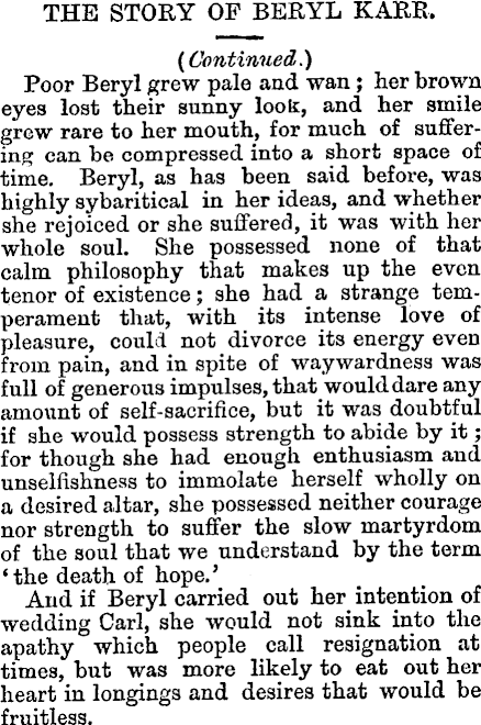 THE STORY OF BERYL KARR. ( Continued.) Poor Beryl grew pale and wan ; her brown eyes lost their sunny loot, and her smile grew rare to her mouth, for much of suffering can be compressed into a short space of time. Beryl, as has been said before, was highly sybaritical in her ideas, and whether she rejoiced or she suffered, it was with her whole soul. She possessed none of that calm philosophy that makes up the even tenor of existence; she had a strange temperament that, with its intense love of pleasure, could not divorce its energy even from pain, and in spite of waywardness was full of generous impulses, that would dare any amount of self-sacrifice, but it was doubtful if she would possess strength to abide by it; for though she had enough enthusiasm and unselfishness to immolate herself wholly on a desired altar, she possessed neither courage nor strength to suffer the slow martyrdom of the soul that we understand by the term ‘the death of hope.’ And if Beryl carried out her intention of wedding Carl, she would not sink into the apathy which people call resignation at times, but was more likely to eat out her heart in longings and desires that would be fruitless.
