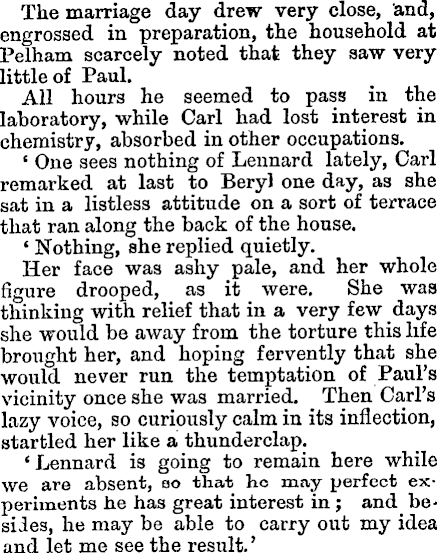 The marriage day drew very close, and, engrossed in preparation, the household at Pelham scarcely noted that they saw very little of Paul, All hours he seemed to pass in the laboratory, while Carl had lost interest in chemistry, absorbed in other occupations. ‘ One sees nothing of Lennard lately, Carl remarked at last to Beryl one day, as she sat in a listless attitude on a sort of terrace that ran along the back of the house. ‘ Nothing, she replied quietly. Her face was ashy pale, and her whole figure drooped, as it were. She was thinking with relief that in a very few days she would be away from the torture this life brought her, and hoping fervently that she would never run the temptation of Paul’s vicinity once she was married. Then Carl’s lazy voice, so curiously calm in its inflection, startled her like a thunderclap. * Lennard is going to remain here while we are absent, oo that he may perfect experiments he has great interest in; and besides, he may be able to carry out my idea and let me see the result. ’