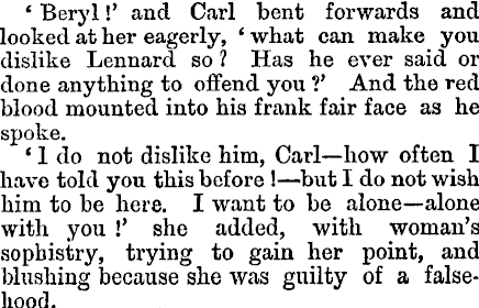* Beryl!’ and Carl bent forwards and looked at her eagerly, ‘ what can make you dislike Lennard so ? Has he ever said or done anything to offend you ?’ And the red blood mounted into his frank fair face as he spoke. ‘ 1 do not dislike him, Carl—how often I have told you this before ! —but I do not wish him to be here. I want to be alone—alone with you !’ she added, with woman’s sophistry, trying to gain her point, and blushing because she was guilty of a falsehood.