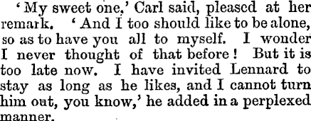‘My sweet one,’ Carl said, pleased at her remark. ‘ And I too should like to be alone, so as to have you all to myself. I wonder I never thought of that before ! But it is too late now. I have invited Lennard to stay as long as he likes, and I cannot turn him out, you know,’ he added in a perplexed manner.