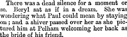 There was a dead silence for a moment or so. Beryl sat as if in a dream. She was wondering what Paul could mean by staying on; and a shiver passed over her as she pictured him at Pelham welcoming her back as the bride of his friend.