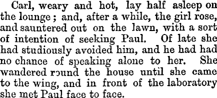 Carl, weary and hot, lay half asleep on the lounge ; and, after a while, the girl rose, and sauntered out on the lawn, with a sort of intention of seeking Paul. Of late she had studiously avoided him, and he had had no chance of speaking alone to her. She wandered round the house until she came to the wing, and in front of the laboratory she met Paul face to face.