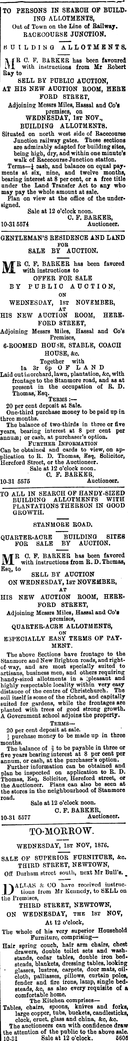 TO PERSONS IN SEARCH OF BUILDING ALLOTMENTS, Out of Town on the Line of Railway. RACECOURSE JUNCTION. BUILDING ALLOTMENTS. MR C. F. BARKER has been favoured with instructions from Mr Robert Ray to SELL BY PUBLIC AUCTION, AT HIS NEW AUCTION ROOM, HEBE FORD STREET, Adjoining Messrs Miles, Hassal and Go’s premises, on WEDNESDAY, Ist NOV., BUILDING ALLOTMENTS. Situated on north west side of Racecourse Junction railway gates. These sections are admirably adapted for building sites, being high, dry, and within one minute’s walk of Racecourse Junction station. Terms—i cash, and balance on equal pay. ments at six, nine, and twelve months, bearing interest at 8 per cent, or a free title under the Land Transfer Act to any who may pay the whole amount at sale. Plan on view at the office of the undersigned. Sale at 12 o’clock noon. C. F. BARKER, 10-315574 Auctioneer, GENTLEMAN’S RESIDENCE AND LAND FOB SALE BY AUCTION. MR C. F. BARKER has been favored with instructions to OFFER FOR SALE BY PUBLIC AUCTION, ON WEDNESDAY, Ist NOVEMBER, AT HIS NEW AUCTION ROOM, HEREFORD STREET, Adjoining Messrs Miles, Hassal and Co’s Premises, 6-ROOMED HOUSE, STABLE, COACH HOUSE, &c. Together with la 3r 6p O F LAND Laid outiuorchard, lawn, plantation, &c, with frontage to the Stanmore road, and as at present in the occupation of R. D. Thomas, Esq. Teems 20 per cent deposit at Sale. One-third purchase money to be paid up in three months. The balance of two-thirds in three or five years, bearing interest at 8 per cent per annum; or cash, at purchaser’s option. FUBTHEE INFOBMATION Can be obtained and cards to view, on application to R. D, Thomas, Esq, Solicitor, Hereford Street, or the Auctioneer. Sale at 12 o’clock noon. C. F. BARKER, 10-31 5575 Auctioneer. TO ALL IN SEARCH OF HANDY-SIZED BUILDING ALLOTMENTS WITH PLANTATIONS THEREON IN GOOD GROWTH. STANMORE ROAD. QUARTER-ACRE BUILDING SITES FOR SALE BY AUCTION. MR C. F. BARKER has been favored with instructions from R. D. Thomas, Esq, to SELL BY AUCTION ON WEDNESDAY, IST NOVEMBER, AT HIS NEW AUCTION ROOM, HEREFORD STREET, Adjoining Messrs Miles, Hassal and Go’s premises, QUARTER-ACRE ALLOTMENTS, ON ESPECIALLY EASY TERMS OF PAYMENT. The above Sections have frontage to the Stanmore and New Brighton roads, and right-of-way, and are most specially suited to artisans, business men, and others requiring handy-sized allotments in a ;pleasant and highly respectable locality within very easy distance of the centre of Christchurch. The soil itself is some of the richest, and capitally suited for gardens, while the frontages are planted with trees of good strong growth. A Government school adjoins the property. Teems—--20 per cent deposit at sale. • purchase money to be made up in three months. The balance of f to be payable in three or five years bearing interest at 8 per cent; per annum, or cash, at the purchaser’s option. Further information can be obtained and plan be inspected on application to E. D. Thomas, Esq, Solicitor, Hereford street, or the Auctioneer. Plans can also be seen at the stores in the neighbourhood of Stanmore road. Sale at 12 o’clock noon. C. F. BARKER, 10-31 5677 Auctioneer. TOMORROW. WEDNESDAY, Ist NOV, 1876. SALE OP SUPERIOR FURNITURE, &c. THIRD STREET, NEWTOWN, Off Durham street south, next Mr Bull’s. __ DALLAS & CO have received iustrnctioua from Mr Kennedy, to SELL on the Premises, THIRD STREET, NEWTOWN, ON WEDNESDAY, the Ist NOV, At 12 o’clock, The whole of his very superior Household Furniture, comprising— Hair spring couch, hair arm chairs, chest drawers, double toilet sets and washstands, cedar tables, double iron bedsteads, blankets, dressing tables, looking glasses, lustres, carpets, door mats, oilcloth, palliasses, pillows, curtain poles, fender and fire irons, lamp, single bedsteads, &c, as also every requisite of a comfortable home. The Kitchen comprises— Tables, chairs, spoons, knives and forks, large copper, tubs, buckets, candlesticks, clock, cruet, glass and china, &c, &c. The auctioneers can with confidence draw the attention of the public to the above sale. 10-31 Sale at 12 o’clock. 5605