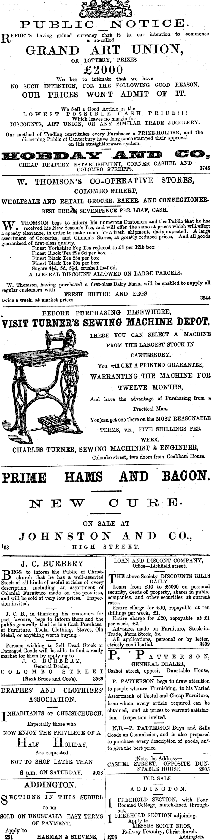 F*^v^^-^f-dpi PUBLIO_NOTIOE. EPORTS having gained currency that it is our intention to commence a so-called GRAND ART UNION, OR LOTTERY, PRIZES £2OOO We beg to intimate that we have NO SUCH INTENTION, FOR THE FOLLOWING GOOD REASON, OUR PRICES WON'T ADMIT OP IT. We Sell a Good Article at the LOWEST POSSIBLE CASH PRICE!!! Which leaves no margin for DISCOUNTS, ART UNION, OR ANY SIMILAR TRADE JUGGLERY. Our method of Trading constitutes every Purchaser a PRIZE-HOLDER, and the discerning Public of Canterbury have long since stamped their approval on this straightforward system. CHEAP DRAPERY ESTABLISHMENT, CORNER CASHEL AND COLOMBO STREETS. 3746 W. THOMSON'S CO-OPERATIVE STORES, COLOMBO STREET, WHOLESALE AND RETAIL GROCER, BAKER AND CONFECTIONER. BEST SEVENPENCE PER LOAF, CASH. W THOMSON begs to inform his numerous Customers and the Public that he has • received his New Season's Tea, and will offer the same at prices which will effect a speedy clearance, in order to make room for a fresh shipment, daily expected. A larg» assortment of Groceries, and Oilmen's Stores, at greatly reduced prices. And all goods guaranteed of first-class quality. Finest Yorkshire Fog Tea reduced to £1 per 121 b box Finest Black Tea 22s 6d per box Finest Black Tea 25s per box Finest Black Tea 30s per box Sugars 4£d, sd, s|d, crushed loaf 6d. A LIBERAL DISCOUNT ALLOWED ON LARGE PARCELS. W. Thomson, having purchased a first-class Dairy Farm, will be enabled to supply all regular customers with __ «„„« 6 FRESH BUTTER AND EGGS twice a week, at market prices. oo4A BEFORE PURCHASING ELSEWHERE, Visit turners sewing machine depot, THERE YOU CAN SELECT A MACHINE FROM THE LARGEST STOCK IN fe CANTERBURY. You will GET A PRINTED GUARANTEE, i WARRANTING THE MACHINE TOR TWELVE MONTHS, And have the advantage of Purchasing from a j Practical Man. k Youlcan get one there on the MOST REASONABLE TERMS, viz., FIVE SHILLINGS PER WEEK. CHARLES TURNER, SEWING MACHINIST & ENGINEER, Colombo street, two doors from Cotkham House. II \m 1 m I * m*\ m 3ST E "W C U REON SALE AT JOHNSTON AND CO., HIGH STREET. J. 0. BTJRBERY EGS to inform the Public of Christ--1 church that he has a well-assorted Stock of all kinds of useful articles of every description, including an assortment of Colonial Furniture made on the premises, and will be sold at very low prices. Inspection invited. J. C. 8., in thanking his customers for past favours, begs to inform them and the public generally that he is a Cash Purchase/ of Furniture, Tools, Clothing, Stoves, Ola Metal, or anything worth buying. Persons wishing to Sell Dead Stock or Damaged Goods will be able to find a ready market for them by applying to J. C. BURBERY, General Dealer, COLOMBO STREET (Next Bruce and Coe's). 3569 DRAPERS' AND CLOTHIERS' ASSOCIATION. "NHABITANTS of CHRISTCHURCH, Especially those who NOW ENJOY THE PRIVILEGE OF A _OLIDAY, Are requested NOT TO SHOP LATER THAN 6 p.m, ON SATURDAY. 4038 ADDINGTON. ECTIONS IN THIS SUBURB SOLD ON UNUSUALLY EASY TERMS OF PAYMENT. Apply to 251 HARMAN & STEVENS. LOAN AND DISCONT COMPANY, Office—Lichfield street. THE above Society DISCOUNTS BILLS DAILY. Loans from £lO to £SOOO on personal security, deeds of property, shares in public companies, and other securities at current rates. Entire charge for £lO, repayable at ten shillings per week, £l. Entire charge for £2O, repayable at £1 per week, £2. Advances made on Furniture, Stock-in - Trade, Farm Stock, &c. All applications, personal or by letter, strictly confidential. 3809 X . JLATTER SON, GENERAL DEALER, Cashel street, opposit Dunstable House. P. PATTERSON begs to draw attention to people who are Furnishing, to his Varied Assortment of Useful and Cheap Furniture, from whom every article required can be obtained, aud at prices to warrant satisfacion. Inspection invited. N.B.—P. PATTERSON Buys and Sells Goods on Commission, and is also prepared to purchase every description of goods, and to give the best price. iNote the AddressCASHEL STREET, OPPOSITE DUNSTABLE FOR SALE. ADDINGTON. ■i FREEHOLD SECTION, with FourJL Roomed Cottage, match-lined throughout. -J FREEHOLD SECTION adjoining. 1 Apply to MESSRS SCOTT BROS, Railway Foundry, Christchurch. 420$ Addington.