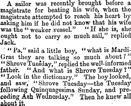 A sailor was recently brought before a magistrate for beating his wife, when the magistrate attempted to reach his heart byasking him if he did not know that his wife was the " weaker vessel." "If she is, she ought not to carry so much sail," replied Jack. " Pa," said a little boy, "what is MardiGraa they are talking so much about 'I" " Shrove Tuesday," replied the well-informed father. " And what is Shrove Tuesday ? " "Look in the dictionary." The boy looked, and saw, "Shrove Tuesday—the Tuesday following Quinquagesima Sunday, and preceding Ash Wednesday." Then he knew all about it.