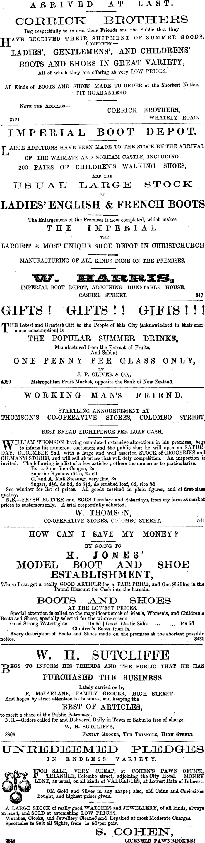 ARBIVEB AT LAST. OOEEIOK BROTHERS Beg respectfully to inform their Friends and the Public that they 'AVE EECEIVED THEIR SHIPMENT OF SUMMER GOODS, Comprising— LADIES', GENTLEMENS', AND CHILDRENS' BOOTS AND SHOES IN GREAT VARIETY, All of which they are offering at very LOW PRICES. All Kinds of BOOTS AND SHOES MADE TO ORDER at the Shortest Notice. FIT GUARANTEED. Note the Address— CORKICK BROTHERS, WHATELY ROAD. IMPERIAL BOOT DEPOT. ARGE ADDITIONS HAVE BEEN MADE TO THE STOCK BY THE ARRIVAL OF THE WAIMATE AND NORHAM CASTLE, INCLUDING 200 PAIRS OF CHILDREN'S WALKING SHOES, AND THE USUAL L .A. HG E STOCK OP LADIES' ENGLISH & FRENCH BOOTS The Enlargement of the Premises is now completed, which makes THE IMPERIAL THE LARGEST & MOST UNIQUE SHOE DEPOT IN OHRISTCHURCH MANUFACTURING OF ALL KINDS DONE ON THE PREMISES. IMPERIAL BOOT DEPOT, ADJOINING DUNSTIBLE HOUSE. CASHEL STREET. 347 GIFTS! GIFTS!! GIFTS!!! HE Latest and Greatest Gift to the People of this City (acknowledged in their enormons consumption) is THE POPULAR SUMMER DRINKS. Manufactured from the Extract of Fniits, And Sold at ONE PENNY PER GLASS ONLY, BY J. P. OLIVER & CO., ) Metropolitan Fruit Market, opposite the Bank of New Zealand. WORKING MAN'S FRIEND. STARTLING ANNOUNCEMENT AT THOMSON'S CO-OPERAVIVE STORES, COLOMBO STREET BEST BREAD EIGHTPENCE PER LOAF CASH. ,'ILLIAM THOMSON having completed extensive alterations in his premises, begs v v to inform his numerous customers and the public that he will open on SATURT»AV TIKfIUMRTO Onrl tniM, o lom a ™A oconvforJ SSTWTK - n ( n.ROr!TCT?Tfi!S and OILMAN'S STORES, and will sell at prices that will defy competition. An inspection is invited. The following is a list of a few articles ; others too numerous to particularise. Extra Superfiine Congou, 2s Superior Kyshow ditto, 2s 6d G. and A. Mail Steamer, very fine, 3s Sugars, 4£d, do sd, do s£d, do crushed loaf, 6d, rice 3d See window for list of prices. All goods marked in plain figures, and of first-class quality. N.B.—FRESH BUTTER and EGGS Tuesdays and Saturdays, from my farm at market prices to customers only. A trial respectfully solicited. W. THOMSuN, CO-OPERATIVE STORES, COLOMBO STREET. 544 HOW CAN I SAVE MY MONEY ? BY GOING TO H. JONES' MODEL BOOT AND SHOE ESTABLISHMENT, Where I can get a really GOOD ARTICLE for a FAIR PRICE, and One Shilling in the Pound Discount for Cash into the bargain. BOOTS AJSTD SHOES AT THE LOWEST PRICES. Special attention is called to the magnificent stock of Men's, Women's, and Children's Boots and Shoes, specially selected for the winter season. Good Strong Watertights ... lis 6d | Good Elastic Sides 14s 6d Children's Boots from Is. Every description of Boots and Shoes made on the premises at the shortest possible notice. 3430 W. H. SUTCLIFFE ~ EGS TO INFORM HIS FRD3NDS AND THE PUBLIC THAT HE HAS PURCHASED THE BUSINESS Lately carried on by R. McFARLANE, FAMILY GROCER, HIGH STREET And hopes by strict attention to business, and keeping the BEST OE ARTICLES, to merit a share of the Public Patronage. N.B.—Orders called for and Delivered Daily in Town or Suburbs freo of charge. W. H. SUTCLIFFE, 3805 Family Grocer, The Triangle, High Street. mSTREDEIEMED PLEDGES IN ENDLESS VARIETY. . at . T7IOR SALE, VERY CHEAP, at COHEN'S PAWN OFFICE, ' TRIANGLE, Colombo street, adjoining the City Hotel. MONEY LENT, as usual, on all kinds of VALUABLES, at Lowest Rate of Interest. Old Gold and Silver in any shape; also, old Coins and Curiosities Bought, and highest prices given. A LARGE STOCK of really good WATCHES and JEWELLERY, of all kinds, always on hand, and SOLD at astonishing LOW PRICES. Watches, Clooks, and Jewellery Cleaned, Repaired at most Moderate Charges. Spectacles to Suit all Sights, from Is 6d"»per pair. S. COHEN, 2642 LICENSED PAWNBROKER 1 }