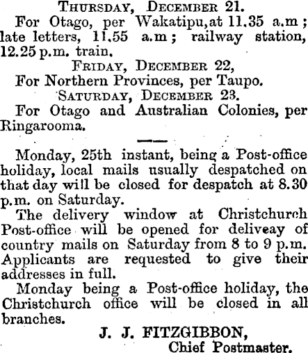 Thursday, December 21. For Otago, per Wakatipu,at 11.35 a.m ; late letters, 11,55 a.m; railway station, 12.25 p.m. train. Friday, December 22, For Northern Provinces, per Taupo. Saturday, December 23. For Otago and Australian Colonies, per Ringarooma. Monday, 25th instant, being a Post-office holiday, local mails usually despatched on that day will be closed for despatch at 8.30 p.m. on Saturday. The delivery window at Christchurch Post-office wifi. be opened for deliveay of country mails on Saturday from 8 to 9 p.m. Applicants are requested to give their addresses in full. Monday being a Post-office holiday, the Christchurch office will be closed in all branches. J. J. FITZGIBBON, Chief Postmaster.