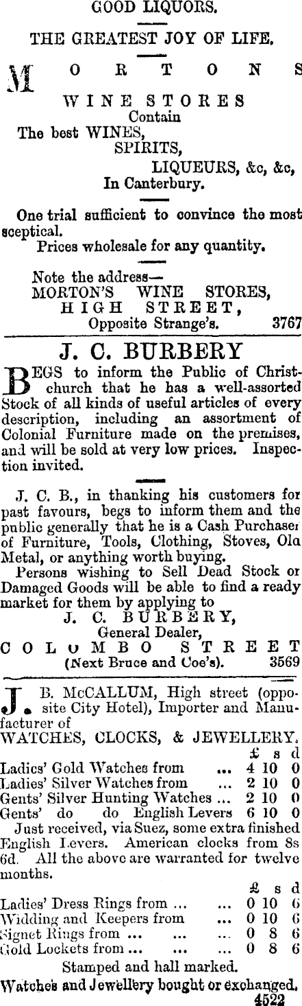 GOOD LIQUORS. THE GREATEST JOY OF LIFE. M ORTONS WINE STORES Contain The best WINES, SPIRITS, LIQUEURS, &c, &c, In Canterbury. One trial sufficient to convince the most sceptical. Prices wholesale for any quantity. Note the address— MORTON’S WINE STORES, HIGH STREET, Opposite Strange’s, 3767 J. 0. BURBERY BEGS to inform the Public of Christchurch that he has a well-assorted Stock of all kinds of useful articles of every description, including an assortment of Colonial Furniture made on the premises, and will be sold at very low prices. Inspection invited. J. C. 8,, in thanking his customers for past favours, begs to inform them and the public generally that he is a Cash Purchasei of Furniture, Tools, Clothing, Stoves, Ola Metal, or anything worth buying. Persons wishing to Sell Dead Stock or Damaged Goods will be able to find a ready market for them by applying to J. C. BURB ER Y, General Dealer, COLOMBO STREET (Next Bruce and Coe’s). 3569 JB. McCALLUM, High street (oppo- • site City Hotel), Importer and Manufacturer of WATCHES, CLOCKS, & JEWELLERY. £ a d Ladies’ Gold Watches from ... 4 10 0 Ladies’Silver Watches from ... 2 10 0 Gents’ Silver Hunting Watches ... 2 10 0 Gents’ do do English Levers 6 10 0 Just received, via Suez, some extra finished English Levers. American clocks from 8s 6d. All the above are warranted for twelve months. Ladies’ Dress Rings from ... Widding and Keepers from Signet Rings from Gold Lockets from A s d ... 0 10 (> ... 0 10 6 ..086 ...0 8 6 Stamped and hall marked. Watches and Jew’ellbry bought or exchanged. 1522