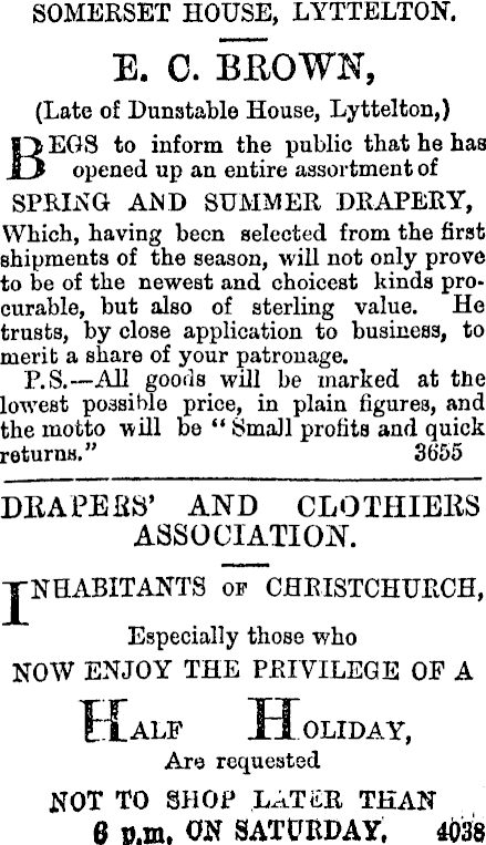 SOMERSET HOUSE, LYTTELTON. B. 0. BROWN, (Late of Dunstable House, Lyttelton,) BEGS to inform the public that he has opened up an entire assortment of SPRING AND SUMMER DRAPERY, Which, having been selected from the first shipments of the season, will not only prove to be of the newest and choicest kinds procurable, but also of sterling value. He trusts, by close application to business, to merit a share of your patronage. P.S.—All goods will be marked at the lowest possible price, in plain figures, and the motto will be “ Small profits and quick returns.” 3655 DBA PE lIS’ AND CLOTHIEBS ASSOCIATION. J"N HABITANTS of CHRISTCHURCH, Especially those who NOW ENJOY THE PRIVILEGE OF A Half Holiday, Are requested NOT TO SHOP LATER THAN 6 p.m, ON SATURDAY, 4038
