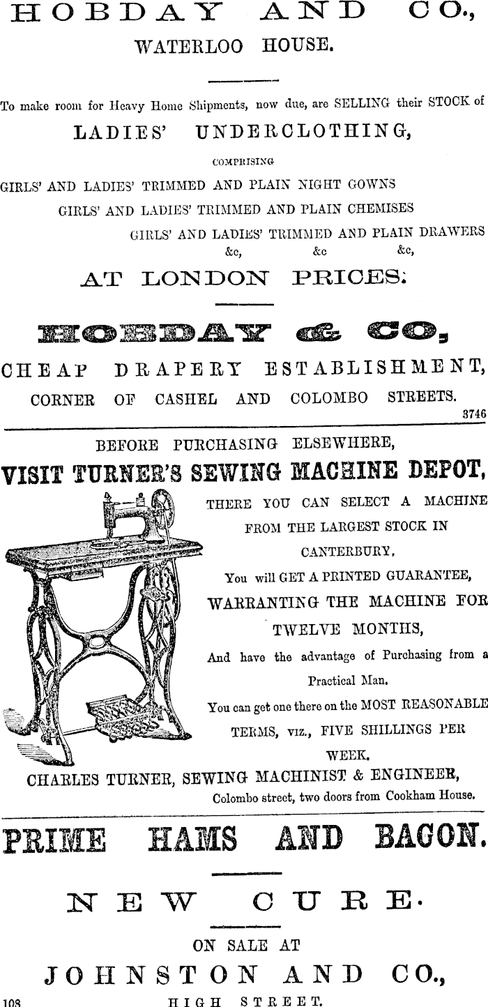 HOBDAY A. 2ST ID 00., WATERLOO HOUSE. To make room for Heavy Home Shipments, now due, are SELLING their STOCK of LADIES’ UNDERCLOTHING, COMPRISING GIRLS’ AND LADIES’ TRIMMED AND PLAIN NIGHT GOWNS GIRLS’ AND LADIES’ TRIMMED AND PLAIN CHEMISES GIRLS’ AND LADIES’ TRIMMED AND PLAIN DRAWERS &c, &c &c, A.T LONDON PRICES. CHEAP DRAPERY ESTABLISHMENT, CORNER OF CASHEL AND COLOMBO STREETS. BEFORE PURCHASING ELSEWHERE, VISIT TURNER’S SEWING MACHINE DEPOT, THERE YOU CAN SELECT A MACHINE FROM THE LARGEST STOCK IN CANTERBURY, You wiU GET A PRINTED GUARANTEE, WARRANTING THE MACHINE FOR TWELVE MONTHS, And have the advantage of Purchasing from a Practical Man. You can get one there on the MOST REASONABLE TERMS, viz., FIVE SHILLINGS PER __ WEEK. CHARLES TURNER, SEWING MACHINIST & ENGINEER, Colombo street, two doors from Cookham House. PRIME HAMS AID BAGON. MEW CUREON SALE AT JOHNSTON AND CO., 108 HIGH STREET.