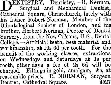 DEN TISTR Y. Dentistry. —K. N orman, Surgical and Mechanical Dentist, Cathedral Square, Christchurch, lately with his father Robert Norman, Member of the Odontological Society of London, and his brother, Herbert Norman, Doctor of Dental Surgery, from the New Orleans, U.S., Dental College.—Artificial teeth, best material and workmanship, at 10s 6d per tooth. For the benefit of the working classes, extractions on Wednesdays and Saturdays at Is per tooth, other days a fee of 2s 6d will be charged. Fillings in gold, amalgam, &c, at reasonable prices. R. NORMAN, Surgeon Dentist, Cathedral Square, 4527