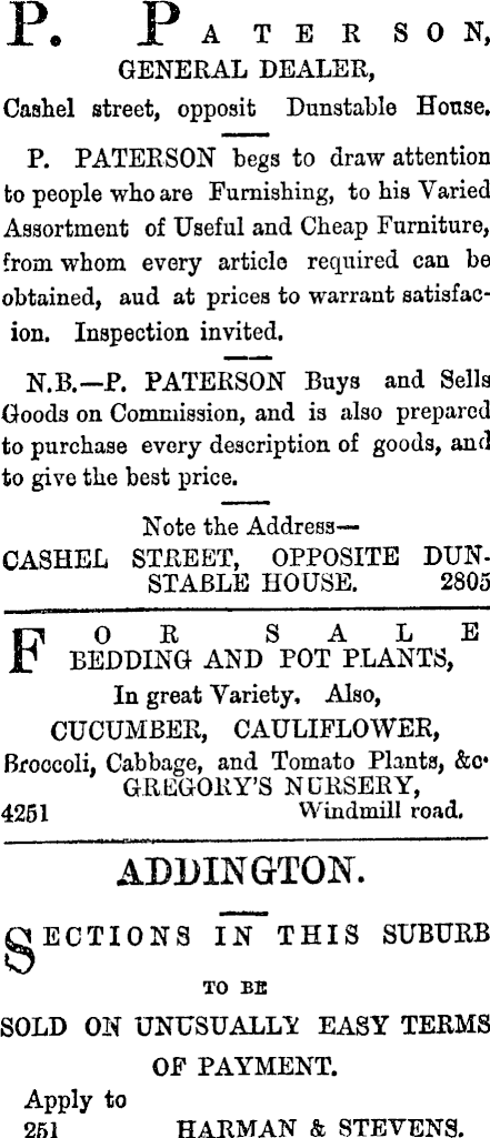 P, Pa ter son, GENERAL DEALER, Cashel street, opposit Dunstable House. P, PATERSON begs to draw attention to people who are Furnishing, to his Varied Assortment of Useful and Cheap Furniture, from whom every article required can be obtained, aud at prices to warrant satisfacion. Inspection invited. N.B.—P. PATERSON Buys and Sells Goods on Commission, and is also prepared to purchase every description of goods, and to give the best price. Note the Address— CASHEL STREET, OPPOSITE DUNSTABLE HOUSE, 2805 For sale BEDDING AND POT PLANTS, In great Variety, Also, CUCUMBER, CAULIFLOWER, Broccoli, Cabbage, and Tomato Plants, &c* GREGORY’S NURSERY, 4251 Windmill road. ADDINGTON. gECTIONS IN THIS SUBURB TO BE SOLD ON UNUSUALLY EASY TERMS OF PAYMENT. Apply to 261 HARMAN & STEVENS.