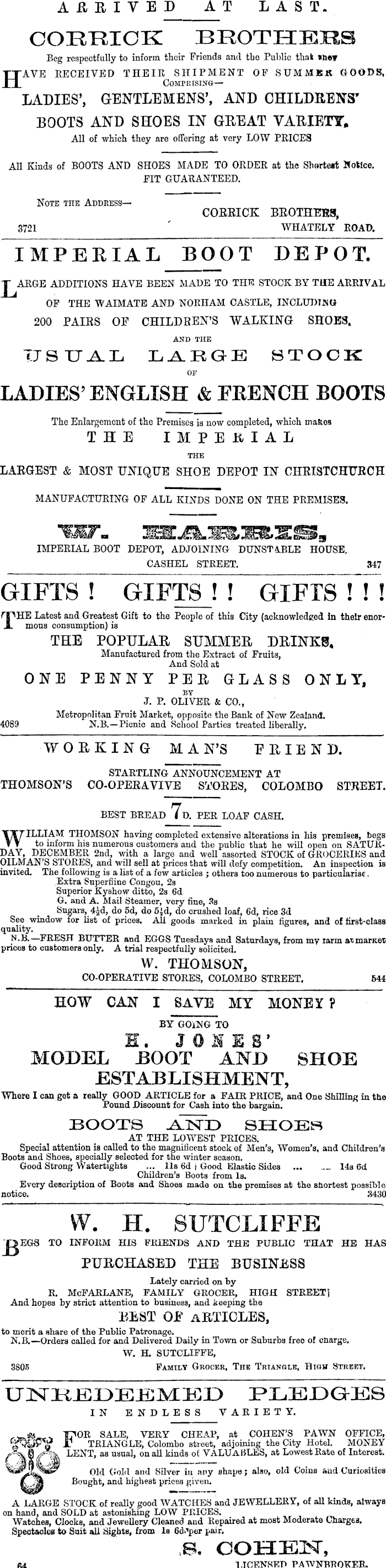 ARRIVED AT LAST. CORRIOK BROTHERS Beg respectfully to inform their Friends and the Public that enay SAVE RECEIVED THEIR SHIPMENT OF SUMMBK HOODS, COMPRISING—LADIES’, GENTLEMENS’, AND CHILDRENS’ BOOTS AND SHOES IN GREAT VARIETY. All of •which they are offering at very LOW PRICES All Kinds of BOOTS AND SHOES MADE TO ORDER at the Shortest Notice. FIT GUARANTEED. Note the Address— COEEICK BEOTHEBS, 3721 WHATELY ROAD, IMPERIAL BOOT DEPOT. ADDITIONS HAVE BEEN MADE TO THE STOCK BY THE ARRIVAL OF THE WAIMATE AND NORHAM CASTLE, INCLUDING 200 PAIES OF CHILDREN’S WALKING SHOES, AND THE USUAL LARGE STOCK! OF LADIES’ ENGLISH & FRENCH BOOTS The Enlargement of the Premises is now completed, which makes THE IMPERIAL THE LAEGEST & MOST UNIQUE SHOE DEPOT IN CHEISTCHUECH MANUFACTURING OF ALL KINDS DONE ON THE PREMISES. HKTIMPERIAL BOOT DEPOT, ADJOINING DUNSTABLE HOUSE. CASHEL STREET. 347 GIFTS ! GIFTsIT GIFTsTT ! Latest and Greatest Gift to the People of this City (acknowledged in their enorJL mens consumption) is THE POPULAR SUMMER DRINKS. Manufactured from the Extract of Fruits, And Sold at ONE PENNY PER GLASS ONLY, BY J. P. OLIVER & CO., Metropolitan Fruit Market, opposite the Bank of New Zealand. 4089 N.B.—Picnic and School Parties treated liberally. WOEKING MAN’S f EIENI). STARTLING ANNOUNCEMENT AT THOMSON’S CO-OPERATIVE STORES, COLOMBO STREET. BEST BREAD ID. PER LOAF CASH. WILLIAM THOMSON having completed extensive alterations in his premises, begs to inform his numerous customers and the public that he will open on SATURDAY, DECEMBER 2nd, with a large and well assorted STOCK of GROCERIES and OILMAN’S STORES, and will sell at prices that will defy competition. An inspection is invited. The following is a list of a few articles ; others too numerous to particularise, Extra Superfiine Congou, 2s Superior Kyshow ditto, 2s 6d G. and A. Mail Steamer, very fine, 3s Sugars, 4£d, do sd, do 5,d, do crushed loaf, 6‘d, rice 3d See window for list of prices. All goods marked in plain figures, and of first-class quality. N-B,—FRESH BUTTER and EGGS Tuesdays and Saturdays, from my iarm at marnet prices to customers only. A trial respectfully solicited, W. THOMSON, CO-OPERATIVE STORES, COLOMBO STREET. 544 HOW CAN I SAVE MY MONEY ? BY GOING TO H. J©l IS’ MODEL BOOT AND SHOE ESTABLISHMENT, Where I can get a really GOOD ARTICLE for a FAIR PRICE, and One Shilling in the Pound Discount for Cash into the bargain. BOOTS AND SHOES AT THE LOWEST PRICES. Special attention is called to the magnificent stock of Men’s, Women’s, and Children’s Boots and Shoes, specially selected for the winter season. Good Strong Watertights ... 11s 6d i Good Elastic Sides 14s 6d Children’s Boots from Is. Every description of Boots and Shoes made on the premises at the siiortest possible notice. 3430 W.H. SUTCLIFFE JgEGS TO INFORM HIS FRIENDS AND THE PUBLIC THAT HE HAS PURCHASED THE BUSINESS Lately carried on by R. McFARLANE, FAMILY GROCER, HIGH STREET] And hopes by strict attention to business, and keeping the BEST OF ARTICLES, to merit a share of the Public Patronage. N.B.—Orders called for and Delivered Daily in Town or Suburbs free of cliargc, W. H. SUTCLIFFE, 3806 Family Grocer, The Triangle, High Street, UNIiJEGJDEJiiNIEL) DLiGJDGIIIS IN ENDLESS VARIETY. FOR SALE, VERY CHEAP, at COHEN’S PAWN OFFICE, TRIANGLE, Colombo street, adjoining the City Hotel. MONEY LENT, as usual, on all kinds of VALUABLES, at Lowest Rato of Interest. Old Gold and Silver in any shape; also, old Coins and Curiosities Bought, and highest prices given. A LARGE STOCK of really good WATCHES and JEWELLERY, of all kinds, always on hand, and SOLD at astonishing LOW PRICES. Watches, Clocks, and Jewellery Cleaned and Repaired at most Moderate Charges, Spectaoloa to Suit all Sights, from la GA’per pair. .B. COHEISr, v,-. 64 LICENSED PAWNBROKER.