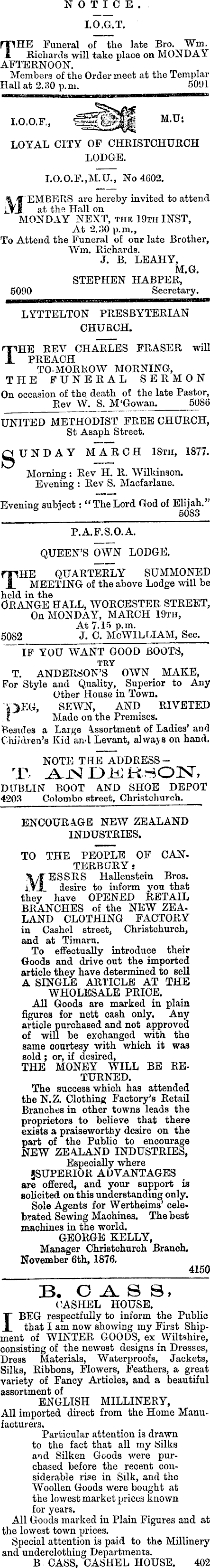 NOTICE. 1.0.G.T. THE Funeral of the late Bro. Wm. Richards will take place on MONDAY AFTERNOON. Members of the Order meet at the Templar Hall at 2.80 p.m. 5091 1.0.0. F., M.U: LOYAL CITY OP CHRISTCHURCH LODGE. L0.0.F.jM.U., No 4602, % f EMBERS arc hereby invited to attend i at the Hall on MONDAY NEXT, tile 19th INST, At 2.30 p.m., To Attend the Funeral of our late Brother, Wm. Richards. J. B. LEAHY, M.G. STEPHEN HABPER, 5090 Secretary, LYTTELTON PRESBYTERIAN CHURCH. THE REV CHARLES FRASER will PREACH TO-MORROW MORNING, THE FUNERAL SERMON On occasion of the, death of the late Pastor, Rev W. S. M'Gowan. 5086 UNITED METHODIST FREE CHURCH, St Asaph Street. gUNDAY MARCH 18th, 1877. Morning: Rev H. R. Wilkinson, Evening : Rev S. Macfarlane. Evening subject: “The Lord God of Elijah.” 5083 P.A.F.S.O.A. QUEEN’S OWN LODGE. THE QUARTERLY SUMMONED MEETING of the above Lodge will be held in the ORANGE HALL, WORCESTER STREET, On MONDAY, MARCH 19th, At 7.15 p.m. 5082 J. C. McWILLIAM, Sec. _ IF YOU WANT GOOD BOOTS, TRY T. ANDERSON’S OWN MAKE, For Style and Quality, Superior to Any Other House in Town. >.>EG, SEWN, AND RIVETED * Made on the Premises. Besides a Large Assortment of Ladies’ and ChiiArea’s Kid and Levant, always on hand. NOTE THE ADDRESST A-iN 1 U K K-iON, DUBLIN BOOT AND SHOE DEPOT 4203 Colombo street, Christchurch. ENCOURAGE NEW ZEALAND INDUSTRIES. TO THE PEOPLE OF CANTERBURY : MESSRS Hallenstein Bros, desire to inform you that they have OPENED RETAIL BRANCHES of the NEW ZEALAND CLOTHING FACTORY in Cashel street, Christchurch, and at Timaru. To effectually introduce their Goods and drive out the imported article they have determined to sell A SINGLE ARTICLE AT THE WHOLESALE PRICE. All Goods are marked in plain figures for nett cash only. Any article purchased and not approved of will be exchanged with the same courtesy with which it was sold ; or, if desired, THE MONEY WILL BE RETURNED. The success which has attended the N.Z. Clothing Factory's Retail Branches in other towns leads the proprietors to believe that there exists a praiseworthy desire on the part of the Public to encourage NEW ZEALAND INDUSTRIES, Especially where {SUPERIOR ADVANTAGES are offered, and your support is solicited on this understanding only. Sole Agents for Wertheims’ celebrated Sewing Machines. The best machines in the world. GEORGE KELLY, Manager Christchurch Branch. November 6th, 1876. 4150 B. O A. 8 S , CASHEL HOUSE. I BEG respectfully to inform the Public that I am now showing my First Shipment of WINTER GOODS, ex Wiltshire, consisting of the newest designs in Dresses, Dress Materials, Waterproofs, Jackets, Silks, Ribbons, Flowers, Feathers, a great variety of Fancy Articles, and a beautiful assortment of ENGLISH MILLINERY, All imported direct from the Home Manufacturers. Particular attention is drawn to the fact that all my Silks and Silken Goods were purchased before the recent considerable rise in Silk, and the Woollen Goods were bought at the lowest market prices known for years. All Goods marked in Plain Figures and at the lowest town prices. Special attention is paid to the Millinery and underclothing Departments. B CASS, CASHEL HOUSE. 402