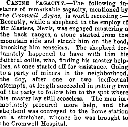 Canine Sagacity.— The following instance of remarkable sagacity, mentioned by the Cromwell Argus, is worth recording : Becently, while a shepherd in the employ of Mr Masters, Nevis, was engaged mustering a the back ranges, a stone started from the mountain Bide and struck him on the head, knocking him senseless. The shepherd fortunately happened to have with him Mb faithful collie, who, finding his master helpless, at once started cff for assistance. Going to a party of miners in the neighborhood, the dog, after one or two ineffectual attempts, at length succeeded in getting two of the party to follow him to the spot where his master lay still senseless. The men immediately procured more help, and the shepherd was conveyed to the home station on a stretcher, whence he was brought to the Cromwell Hospital.