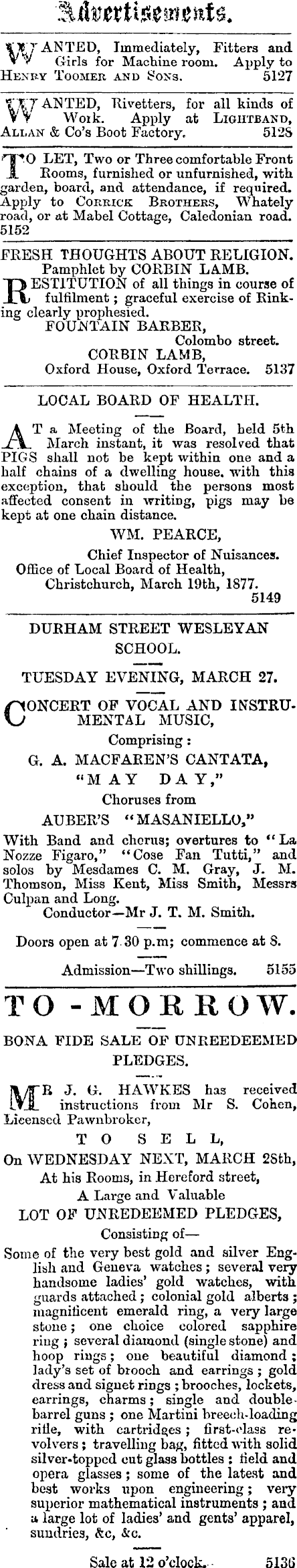 Mwfeemimts. OT ANTED, Immediately, Fitters and ▼ r Girls for Machine room. Apply to Henry Toomer and Sons. 5127 ANTED, Rivetters, for all kinds of »t Woik. Apply at Liohtband, Allan & Co's Boot Factory. 512 S P.O LET, Two or Three comfortable Front Jl Eooms, furnished or unfurnished, with garden, board, and attendance, if required. Apply to Corrick Brothers, Whately road, or at Mabel Cottage, Caledonian road. 5152 FRESH THOUGHTS ABOUT RELIGION. Pamphlet by CORBIN LAMB. "13 ESTITUTION of all things in course of X\i fulfilment; graceful exercise of Kinking clearly prophesied. FOUNTAIN BARBER, Colombo street. CORBIN LAMB, Oxford House, Oxford Terrace. 5137 LOCAL BOARD OF HEALTH. AT a Meeting of the Board, held sth March instant, it was resolved that PIGS shall not be kept within one and a half chains of a dwelling house, with this exception, that should the persons most affected consent in writing, pigs may be kept at one chain distance. WM. PEARCE, Chief Inspector of Nuisances. Office of Local Board of Health, Christchurch, March 19th, 1877. 5149 DURHAM STREET WESLEYAN SCHOOL. TUESDAY EVENING, MARCH 27. ONCERT OF VOCAL AND IN'STRU- / MENTAL MUSIC, Comprising : G. A. MACFAREN'S CANTATA, "MAY DAY," Choruses from AUBER'S "MASANIELLO," With Band and chorus; overtures to "La Nozze Figaro," "Cose Fan Tutti," and solos by Mesdames C. M. Gray, J. M. Thomson, Miss Kent, Miss Smith, Messrs Culpan and Long. Conductor—Mr J. T. M. Smith. Doors open at 7 30 p.m; commence at 8. Admission —Two shillings. 5155 TO -MORROW. BONA FIDE SALE OF UNREEDEEMED PLEDGES. jl/TR J. G. HAWKES has received L»JL instructions from Mr S. Cohen, Licensed Pawnbroker, TO SELL, On WEDNESDAY NEXT, MARCH 28th, At his Rooms, in Hereford street, A Large and Valuable LOT OF UNREDEEMED PLEDGES, Consisting of— Some of the very best gold and silver English and Geneva watches; several very handsome ladies' gold watches, with guards attached; colonial gold alberts ; magnificent emerald ring, a very large stone; one choice colored sapphire ring ; several diamond (single stone) and hoop rings; one beautiful diamond ; lady's set of brooch and earrings ; gold dress and signet rings ; brooches, lockets, earrings, charms; single and double ■ barrel guns ; one Martini breech-loading riile, with cartridges ; first-olass revolvers ; travelling bag, fitted with solid silver-topped cut glass bottles : field and opera glasses; some of the latest and best works upon engineering; veiy superior mathematical instruments ; and a large lot of ladies' and gents' apparel, sundries, &c, &c. Sale at 12 o'clock- 513 G