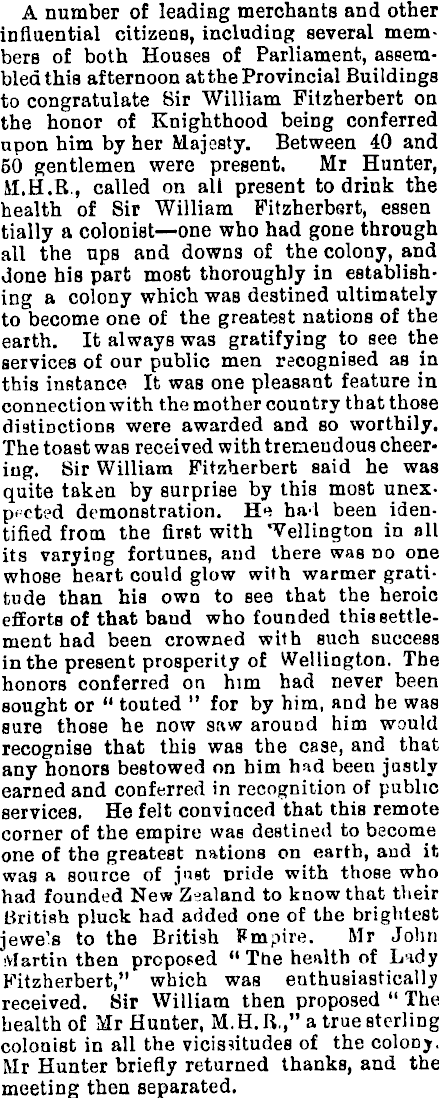 A number of leading merchants and other influential citizens, including several members of both Houses of Parliament, assembled this afternoon at the Provincial Buildings to congratulate Sir William Pitzherbert on the honor of Knighthood being conferred upon him by her Majesty. Between 40 and 50 gentlemen were present. Mr Hunter, M.H.R., called on all present to drink the health of Sir William Fitzherbert, essen tially a colonist —one who had gone through all the ups and downs of the colony, and done his part most thoroughly in establishing a colony which was destined ultimately to become one of the greatest nations of the earth. It always was gratifying to see the services of our public men recognised as in this instance It was one pleasant feature in connection with the mother country that those distinctions were awarded and so worthily. The toast was received with tremendous cheering. Sir William Fitzherbert said he was quite taken by surprise by this most unexpected demonstration. He ha'l been identified from the first with Wellington in all its varying fortunes, and there was no one whose heart could glow with warmer gratitude than his own to see that the heroic efforts of that band who founded this settlement had been crowned with such success in the present prosperity of Wellington. The honors conferred on him had never been sought or " touted " for by him, and he was sure those he now saw around him would recognise that this was the case, and that any honors bestowed on him had been justly earned and conferred in recognition of public services. He felt convinced that this remote corner of the empire was destined to become one of the greatest nations on earth, and it was a source of just pride with those who had founded New Zealand to know that their British pluck had added one of the brightest jewe's to the British Fmpire. Mr John ivfartin then proposed " The health of Lady Fitzherbert," which was enthusiastically received. Sir William then proposed " The health of Mr Hunter, M.H. IV," a true sterling colonist in all the vicissitudes of the colony, Mr Hunter briefly returned thanks, and the meeting then separated.