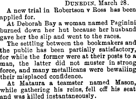 Dunedin, March 28. A new trial in Robertson v Ross has been applied for. At Deborah Bay a woman named Paginini burned down her hut because her husband gave her the slip and went to the races. The settling between the bookmakers and the public has been partially satisfactory, for while the former were at their posts to a man, the latter did not muster in strong force, and many metallicans were bewailing their misplaced confidence. At Mataura a teamster named Mason, while gathering his reins, fell off his seat and was killed instantaneously.