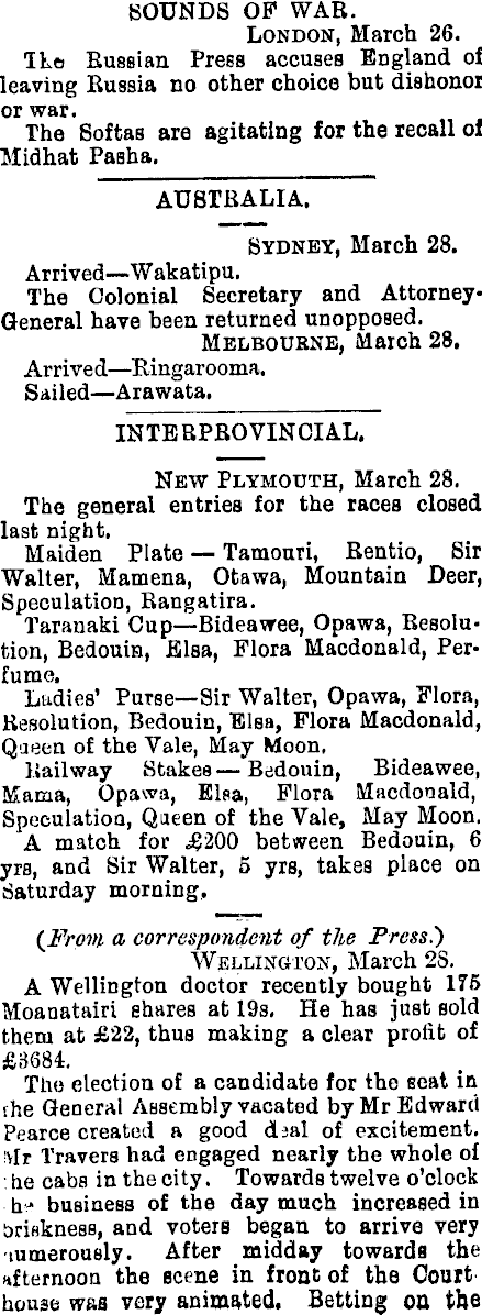 BOUNDS OP WAR. London, March 26. Ike Russian PreßS accuses Ed gland of leaving Russia no other choice but dishonor or war. The Softas are agitating for the recall of Midhat Pasha. AUSTRALIA. Sydney, March 28. Arrived—Wakatipu. The Colonial Secretary and AttorneyGeneral have been returned unopposed. Melbourne, March 28. Arrived —Bingarooma. Sailed —Arawata. INTBRPROVINCIAL. New Plymouth, March 28. The general entries for the races closed last night. Maiden Plate Tamouri, Rentio, Sir Walter, Mamena, Otawa, Mountain Deer, Speculation, Rangatira. Taranaki Cup—Bideawee, Opawa, Resolution, Bedouin, Blsa, Flora Macdonald, Perfume. Ladies' Purse—Sir Walter, Opawa, Flora, Resolution, Bedouin, Blsa, Flora Macdonald, Queen of the Vale, May Moon, Railway Stakeß Bedouin, Bideawee, Mama, Opawa, Elsa, Flora Macdonald, Speculation, Queen of the Vale, May Moon. A match for .£2OO between Bedouin, 6 yra, and Sir Walter, 5 yrs, takes place on Saturday morning, {From a correspondent of the Press.) Wellington, March 28. A Wellington doctor recently bought 175 Moanatairi shares at 19s, He has just sold them at £22, thus making a clear profit of £3684, The election of a candidate for the seat in rhe General Assembly vacated by Mr Bdwarci Pearce created a good daal of excitement. Air Travers had engaged nearly the whole of he cabs in the city. Towards twelve o'clock b j business of the day much increased in briskness, and voterß began to arrive very lumerously. After midday towards the afternoon the scene in front of the Court house was very animated. Betting on the