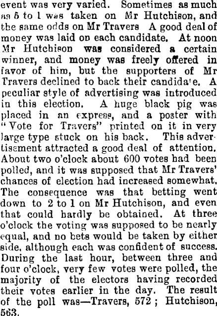 event was very varied. Sometimes as much an 5 to I w»s taken on Mr Hutchison, and the same odds on Mr Travers A good deal of money was laid od each candidate. At noon Mr Hutchison waa considered a certain winner, and money was freely offered in favor of him, but the supporters of Mr Travers declined to back their Candida*e. A peculiar style of advertising was introduced in this election. A huge black pig was placed in an express, and a poster with " Vote for Travers" printed on it in very large type stuck on his back. This advertisement attracted a good deal of attention. About two o'clock about 600 votes had been polled, and it was supposed that Mr Travers' chances of election had increased somewhat. The consequence was that betting went down to 2 to 1 on Mr Hutchison, and even that could hardly be obtained. At three o'clock the voting was supposed to be nearly equal, and no bets would be taken by either side, although each was confident of success. During the last hour, between three and four o'clock, very few votes were polled, the majority of the electors having recorded their votes earlier in the day. The result of the poll was—Travers, 572 ; Hutchison, 563.