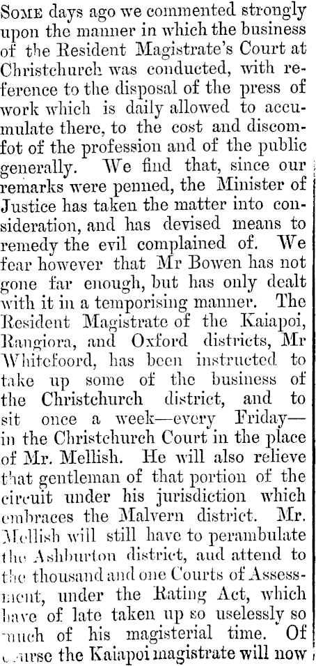 Some days ago we commented strongly upon the manner in which the business of the Resident Magistrate’s Court at Christchurch was conducted, with reference to the disposal of the press of work which is daily allowed to accumulate there, to the cost and discomfot of the profession and of the public generally. We find that, since our , remarks were penned, the Minister of Justice has taken the matter into consideration, and has devised means to remedy the evil complained of. We fear however that Mr Bowen has not gone far enough, but has only dealt with it in a temporising manner. The Resident Magistrate of the Kaiapoi, Rangiora, and Oxford districts, Mr Whitcfoord, has been instructed to take up some of the business of the Christchurch district, and to sit once a week —every Friday—in the Christchurch Court in the place of Mr. Mellish. He will also relieve that gentleman of that portion of the circuit under his jurisdiction which embraces the Malvern district. Mr. Mellish will still have to perambulate the Ashburton district, and attend to the thousand and one Courts of Assessment, under the Rating Act, which have of late taken up so uselessly so much of his magisterial time. Of , arse the Kaiapoi magistrate will now ,