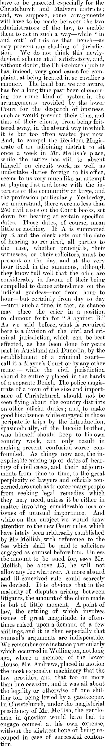 have to be gazetted especially tor the Christchurch and Malvern districts; and, we suppose, some arragements will have to be made between the two administrators of the law, to enable them to act in such a way —while “ in and out” of this or that bench —as may prevent any clashing of jurisdiction. A\ r c do not think this newlydevised scheme at all satisfactory, and, without doubt, the Christchurch public lias, indeed, very good cause for complaint, at being treated in so cavalier a manner. The local bar, we are aware, has for a long time past been clamouring for some kind of system in the arrangements provided by the lower Court for the despatch of business, such as would prevent their time, and that of their clients, from being frittered away, in the absurd way in which it is but too often wasted just now. And, to compel the Resident Magistrate of an adjoining district to sit once a week in Mr. Mellish’s place, while the latter has still to absent himself on circuit work, as well as undertake duties foreign to his office, seems to us very much like an attempt at playing fast and loose with the interests of the community at large, and the profession particularly. Yesterday, we understand, there were no loss than 250 civil cases on the Court books, set down for hearing at certain specified dates. Those dates, of course, mean little or nothing. If A is summoned by B, and the clerk sets out the date of hearing as required, all parties to the case, whether principals, their witnesses, or their solicitors, must be present on the day, and at the very hour fixed in the summons, although they know full well that the odds are considerably in favour of their being compelled to dance attendance on the judicial goddess-—not from hour to hour—but certainly from day to day —until such a time, in fact, as chance may place the crier in a position to clamour forth for “ A against B.” As we said before, what is required here is a division of the civil and criminal jurisdiction, which can be best effected, as has been done for years past in Auckland and Dunedin, by the establishment of a criminal court — call it a Mayor’s Court or by any other name while the civil jurisdiction should be entirely placed in the hands of a separate Bench. The police magistrate of a town of the size and importance of Christchurch should not be seen dying about the country districts on other official duties; and, to make good his absence while engaged in those peripatetic trips by the introduction, spasmodically, of the bucolic brother, who himself should keep to his own country work, can only result in making present confusion worse confounded. As things now arc, the inexplicable mixing up of dates of hearings of civil cases, and their adjournments from time to time, to the great perplexity of lawyers and officials concerned, are such as to deter many people from seeking legal remedies which they may need, unless it be either in matter involving considerable loss or issues of unusual importance. And while on this subject we would draw attention to the new Court rules, which have lately been arbitrarily established by Mr Mellish, with reference to the fee which shall be paid to solicitors engaged as counsel before him. Unless the amount to be sued for, says Mr. Mellish, be above £5, he will not allow any fee whatever. A more absurd and ill-conceived rule could scarcely be devised. It is obvious that in the majority of disputes arising between litigants, the amount of the claim made is but of little moment. A point of law, the settling of which involves issues of great magnitude, is oftentimes raised upon a demand of a few shillings, and it is then especially that counsel’s arguments are iudispenable. We remember one instance particularly which occurred in Wellington, not longago, where a member of the Lower House, Mr. Andrews, placed in motion the most expensive machinery that the law provides, and that too on more than one occasion, and it was all about the legality or otherwise of one shilling toll being levied by a gatekeeper. In Christchurch, under the magisterial presidency of Mr. Mellish, the gentleman in question would have had to engage counsel at his own expense, without the slightest hope of being recouped in case of successful contention.