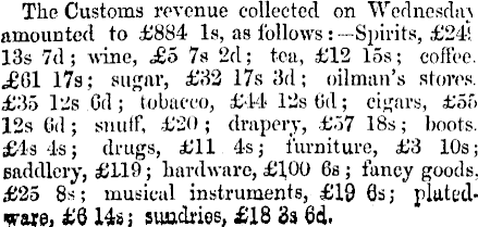 The Customs revenue collected on Wednesday amounted to £BB4 Is, as follows:—Spirits, £24! 13s 7d; wine, £5 7a 2d; tea, £l2 15s: coffee. .£Ol 17s; sugar, £32 17s 3d; oilman’s stores. £35 12s Od; tobacco, £44 12s fid; cigars, £55 12s Od; snuff, £2O; drapery, £57 18s; boots. £4s 4s; drugs, £ll 4s; furniture, £3 10s; saddlery, £110; hardware, £IOO Cs ; fancy goods, £25 8s; musical instruments, £l9 6s; platedware, £6 14s; sundries, £lB 3s 6d.
