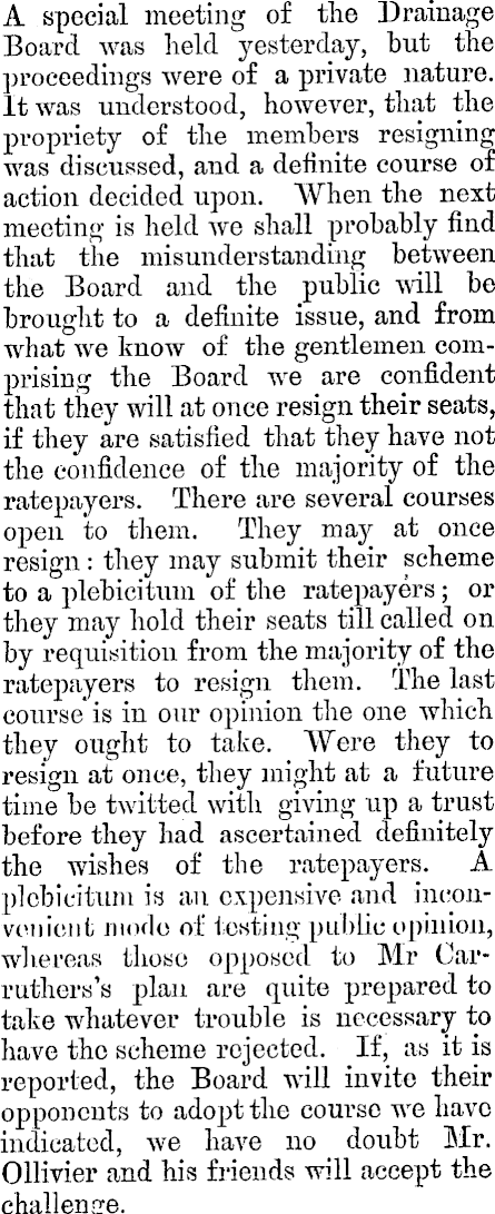 A special meeting of the Drainage Board was held yesterday, hut the proceedings were of a private nature. It was understood, however, that the propriety of the members resigning was discussed, and a definite course of action decided upon. When the next meeting is held we shall probably find that the misunderstanding between the Board and the public will be brought to a definite issue, and from what we know of the gentlemen comprising the Board we are confident that they will at once resign their seats, if they are satisfied that they have not the confidence of the majority of the ratepayers. There are several courses open to them. They may at once resign: they may submit their scheme to a plehicitum of the ratepayers; or they may hold their seats till called on by requisition from the majority of the ratepayers to resign them. The last course is in our opinion the one which they ought to take. Were they to resign at once, they might at a future time he twitted with giving up a trust before they had ascertained definitely the wishes of the ratepayers. A plehicitum is an expensive and inconvenient mode of testing public opinion, whereas those opposed to Mr Carruthers’s plan are quite prepared to take whatever trouble is necessary to have the scheme rejected. If, as it is reported, the Board will invite their opponents to adopt the course avc have indicated, we have no doubt Mr. Ollivier and his friends will accept the challenge.