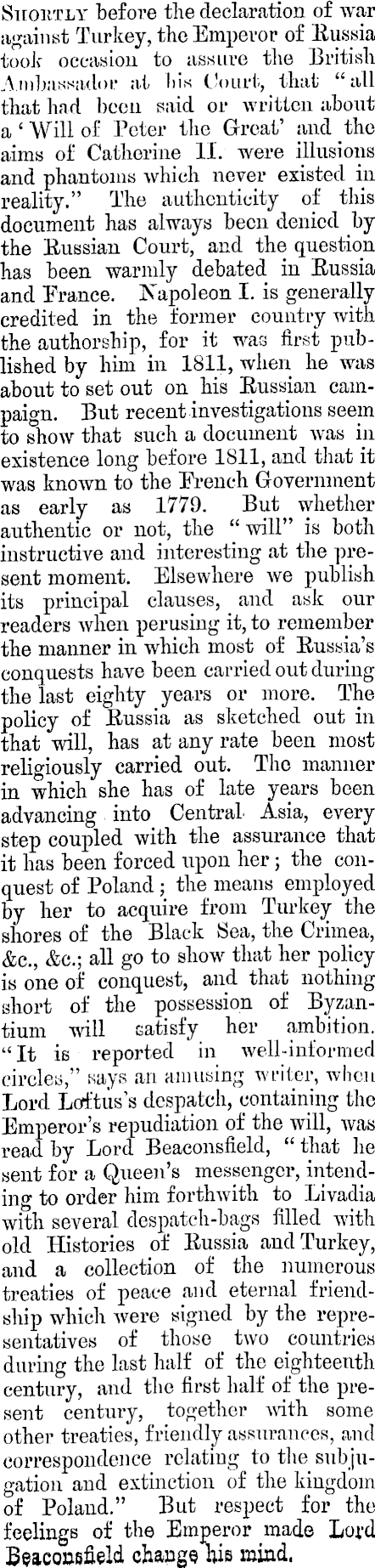 Skohtly before the declaration of war against Turkey, the Emperor of Eussia took occasion to assure the British Ambassador at Ins Court, that “all that had been said or written about a ‘ Will of Peter the Great’ and the aims of Catherine 11. were illusions and phantoms which never existed in reality.” The authenticity of this document has always been denied by the Eussiau Court, and the question has been warmly debated in Eussia and France. Napoleon I. is generally credited in the former country with the authorship, for it was first published by him in 1811, when he was about to set out on his Eussian campaign. But recent investigations seem to show that such a document was in existence long before 1811, and that it was known to the French Government as early as 1779. But whether authentic or not, the “ will” is both instructive and interesting at the present moment. Elsewhere we publish its principal clauses, and ask our readers when perusing it, to remember the manner in which most of Eussia’s conquests have been carried out during the last eighty years or more. The policy of Eussia as sketched out in that will, has at any rate been most religiously carried out. The manner in which she has of late years been advancing into Central Asia, every step coupled with the assurance that it has been forced upon her; the conquest of Poland ; the means employed by her to acquire from Turkey the shores of the Black Sea, the Crimea, &c., &c.; all go to show that her policy is one of conquest, and that nothing short of the possession of Byzantium will satisfy her ambition. “It is reported in well-informed circles,” says an amusing writer, when Lord Loft us’s despatch, containing the Emperor’s repudiation of the will, was read by Lord Beaconsfield, “ that lie sent for a Queen’s messenger, intending to order him forthwith to Livadia with several despatch-bags filled with old Histories of Eussia and Turkey, and a collection of the numerous treaties of peace and eternal friendship which were signed by the representatives of those two countries during the last half of the eighteenth century, and the first half of the present century, together with some other treaties, friendly assurances, and correspondence relating to the sub jugation and extinction of the kingdom of Poland.” But respect for the feelings of the Emperor made Lord Beaconsfield change Ids mind.
