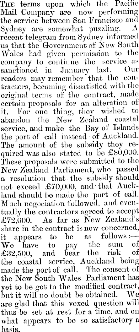 The terms upon which the Pacific Mail Company are now performing the sendee between San Francisco and Sydney are somewhat puzzling. A. recent telegram from Sydney informed us, that the Government of New South Wales had given permission to the company to continue the service as sanctioned in January last. Our readers may remember that the contractors, becoming dissatisfied with the original terms of the contract, made certain proposals for an alteration of it. For one thing, they wished to abandon the New Zealand coastal service, and make the Bay of Islands the port of call instead of Auckland. The amount of the subsidy they required was also stated to ho £BO,OOO. These proposals were submitted to the New Zealand Parliament, who passed a resolution that the subsidy should not exceed £70,000, and that Auckland should be made the port of call. Much ncgociation followed, and eventually the contractors agreed to accept £72,000. As far as New Zealand’s share in the contract is now concerned, it appears to bo as follows: — We have to pay the sum of £32,500, and bear the risk of the coastal service, Auckland being made the port of call. The consent of the New South Wales Parliament has yet to be got to the modified contract, but it will no doubt be obtained. We are glad that this vexed question will thus be set at rest for a time, and on what appears to be so satisfactory a basis.