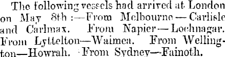 The following vessels hod arrived at London on May Bth : —From Melbourne Carlisle and Carl max. From Napier Loehnagar. From Lyttelton—Waimca. From Wellington—Howrah. From Sydney—Fainoth.
