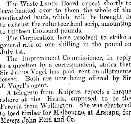 The Waste Lands Board expect shortly to have handed over to them the whole of the confiscated lands, which will be brought in to exhaust the volunteer land scrip, amounting to thirteen thousand pounds. The Corporation have resolved to strike a general rate of one shilling in the pound on July Ist. The Improvement Commissioner, in reply to a question by a correspondent, states that Sir Julius Vogel has paid rent on allotments leased. Both are now being offered by Sir J. Vogel’s agent. A telegram from Knipnra reports a barque ashore at the Heads, supposed to be the Foronia from Wellington. She was chartered to load timber for Melbourne, at Aratapu, for Mecsp John Keid and Co.