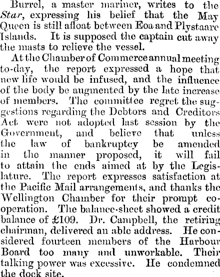 Barrel, a master mariner, writes to the Star, expressing his belief that the May Queen is still afloat between Eoa and Plystaarc Islands. It is supposed the captain cub away the masts to relieve the vessel. At the Chamber of Commerce annual meeting to-day, the report expressed a hope that now life would bo infused, and the influence of the body bo augmented by the late increase of members. The committee regret the suggestions regarding the Debtors and Creditors Act were not adopted last session by the Government, and believe that unless the law of bankruptcy be amended in the manner proposed, it will fail to attain (he ends aimed at by the Legislature. The report expresses satisfaction at the Pacific Mail arrangements, and thanks the Wellington Chamber for their prompt cooperation. The balance-sheet showed a credit balance of £lO9. Dr. Campbell, the retiring chairman, delivered an able address. He considered fourteen members of the Harbour Board too many and unworkable. Their talking power was excessive. He condemned the dock site.