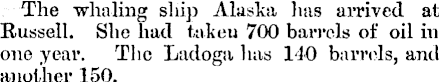 The whaling ship Alaska has arrived at Russell. She had taken 700 barrels of oil in one year. The Ladoga has 110 barrels, and another 150.