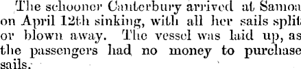 The schooner Canterbury arrived at Samoa, on April 12th sinking, with all her sails split, or blown away. Tire vessel was laid up, as the passengers had no money to purchase sails.