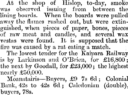 At the shop of Hislop, to-day, smoke was observed issuing from between the lining boards. When the boards were pulled away the flames rushed out, but were extinguished, when pieces of paper, bones, pieces of raw meat and candles, and several wax vestas were found. It is supposed that the fire was caused by a rat eating a match. The lowest tender for the Kaipara Railway is by Larkinson and O’Brien, for £16,800; the next by Goodall, for £23,000; the highest nearly £50,000. Moanatairis —Buyers, £9 7s 6d ; Colonial Bank, 42s to 42s 6d; Caledonian (double), buyers, 78s.