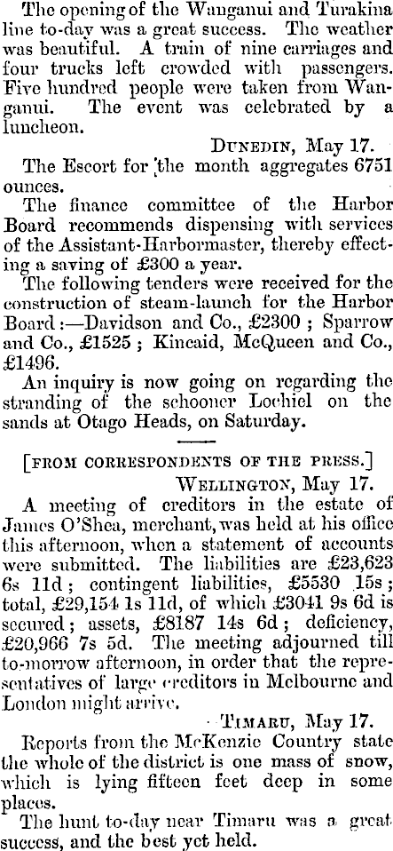 The opening of the Wanganui and Turakina line to-day was a great success. The weather was beautiful. A train of nine carriages and four trucks left crowded with passengers. Fire hundred people were taken from Wanganui. The event was celebrated by a luncheon. Dunedin, May 17. The Escort for 'the month aggregates 6751 ounces. The finance committee of the Harbor Board recommends dispensing with services of the Assistant-Harbormaster, thereby effecting a saving of £3OO a year. The following tenders were received for the construction of steam-launch for the Harbor Board :—Davidson and Co., £2300 ; Sparrow and Co., £1525 ; Kincaid, McQueen and Co., £1496. An inquiry is now going on regarding the stranding of the schooner Lochiel on the sands at Otago Heads, on Saturday. [prom correspondents of the press.] Wellington, May 17. A meeting of creditors in the estate of Janies O’Shea, merchant,was held at his office this afternoon, when a statement of accounts were submitted. The liabilities arc £23,623 6s lid; contingent liabilities, £5530 15s; total, £29,154 Is lid, of which £3041 9s 6d is secured; assets, £BIB7 14s 6d; deficiency, £20,966 7s sd. The meeting adjourned till to-morrow afternoon, in order that the representatives of large creditors in Melbourne and London might arrive, Timaru, May 17. Reports from the McKenzie Country state the whole of the district is one mass of snow, which is lying fifteen feet deep in some places. The hunt to-day near Timaru was a great success, and the b est yet held.