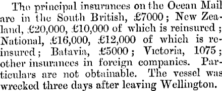 The principal insurances on the Ocean Mail arc in flic South British, £7000; New Zealand, £20,000, £IO,OOO of which is reinsured ; National, £16,000, £12,000 of which is reinsured ; Batavia, £5000; Victoria, 1075; other insurances in foreign companies. Particulars are not obtainable. The vessel was wrecked three days after leaving Wellington.
