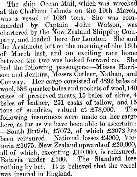 The ship Ocean Mail, which was wrecked at the Chatham Islands on the 19th March, was a vessel of 1039 tons. She -was commanded by Captain John Watson, was chartered by the New Zealand Shipping Company, and loaded here for London. She and the Avalanche left on the morning of the 16th of March last, and an exciting race homo between the two was looked forward to. She had the following passengers:—Misses Harrison and Jenkins, Messrs Cotleer, Nathan, and Conway. Her cargo consisted of 4892 bales of wool, 586 quarter bales and pockets of wool, 140 cases of preserved meats, 15 bales of skins, 4 bales of leather, 251 casks of tallow, and 15 tons of sundries, valued at £78,000. The following insurances were made on her cargo here, as far as wo have been able to ascertain : —South British, £7072, of which £2072 lias been reinsured. National losses £4OOO, Victoria £1075, New Zealand upwards of £20,000, all of which, excepting £IO,OOO, is reinsured. Batavia under £SOO. The Standard lose nothing by her. It is believed that the vessel was insured in England.