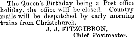 The Queen’s Birthday being a Post office holiday, the office will be closed. Country mails will be despatched by early morning trains from Christchurch. J. J. FITZGIBRON. Chief Poßtmnator