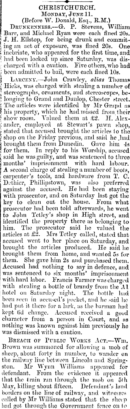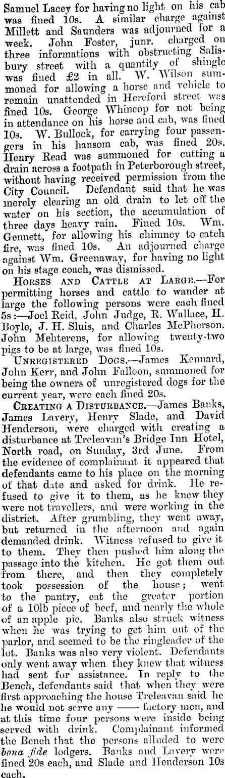 Samuel Lacey for having no light on his cab ■was fined iOs. A similar charge against Millett and Saunders was adjourned for a ■week. John Foster, junr. charged on three informations with obstructing Salisbury street with a quantity of shingle was fined £2 in all. W. Wilson summoned for allowing a horse and vehicle to remain unattended in Hereford street was fined 10s. George Whincop for not being in attendance on his horse and cab, was fined 10s. W. Bullock, for carrying four passengers in his hansom cab, was fined _ 20s. Henry Read was summoned for cutting a drain across a footpath in I?eterborough sti cet, without having received permission from the City Council. Defendant said that he was merely clearing an old drain to let off the water on his section, the accumulation of three days heavy rain. Fined 10s. Wm. Gennett, for allowing his chimney to catch fire, was fined 10s. An adjourned charge against Wm. Greenaway, for having no light on his stage coach, was dismissed. Houses and Cattle at Large. —For permitting horses and cattle to wander at large the following persons were each fined 5s: —Joel Reid, John Judge, R. Wallace, H. Boyle, J. H. Sluis, and Charles McPherson. John Mehterens, for allowing twenty-two pigs to be at large, was fined 10s. Unregistered Dogs. —James Kennard, John Kerr, and John Falloon, summoned for being the owners of unregistered dogs for the current year, were each fined 20s. Creating a Disturbance. —James Banks, James Lavery, Henry Slade, and David Henderson, were charged with creating a disturbance at Treleavan’s Bridge Inn Hotel, North road, on Sunday, 3rd June. From the evidence of complainant it appeared that defendants came to his place on the morning of that date and asked for drink. He refused to give it to them, as he knew they were not travellers, and were working in the district. After grumbling, they went away, but returned in the afternoon and again demanded drink. Witness refused to give it to them. They then pushed him along the passage into the kitchen. Ho got them out from there, and then they completely took possession of the house; went to the pantry, eat the greater portion of a 101 b piece of beef, and nearly the whole of an apple pic. Banks also struck witness when he was trying to get him out of the parlor, and seemed to be the ringleader of the lot. Banks was also very violent. Defendants only went away when they knew that witness had sent for assistance. In reply to the Bench, defendants said that when they were first approaching the house Trcleavan said he he would nob serve any factory men, and at this time four persons were inside being served with drink. Complainant informed the Bench that the persons alluded to were bona fide lodgers. Banks and Lavery were fined 20s each, and Slade and Henderson 10s each.