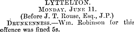 LYTTELTON. Monday, June 11. (Before J. T. Rouse, Esq., J.P.) Drunkenness. —Wm. Robinson for this offence was fined ss.